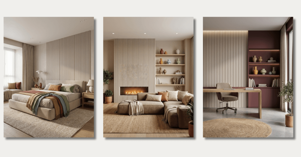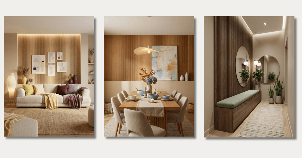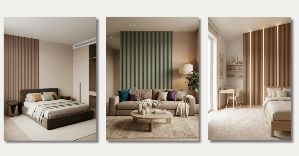 Celkový farebný smer je dnes jednoznačný: zemité pastelové tóny. Do popredia sa dostáva mocha mousse (teplá hnedá), matná zelená, kašmír či perleťová sivá. Tieto farby pre lamely na stenu nepôsobia agresívne, no je dôležité premyslieť ich použitie – najmä rozsah a umiestnenie. Aby interiér nepôsobil prehnane, odporúčame ich kombinovať s jemnými béžovými, pieskovými alebo vanilkovo ladenými tónmi, ktoré priestor vyvážia a zjemnia. Výsledkom je harmonický interiér, ktorý pôsobí prirodzene a nadčasovo.
